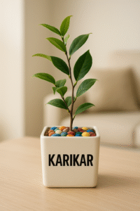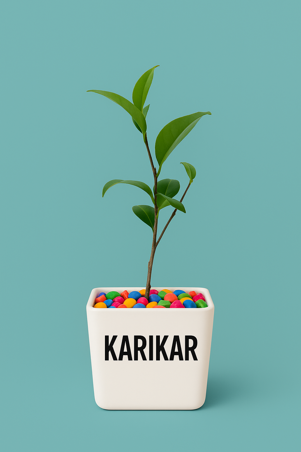 This healthy, rooted sapling is elegantly potted in a minimalist white planter, topped with vibrant multicolor decorative stones, and highlighted with your bold brand name KARIKAR in BOLD BLACK font, delivering a modern, premium, minimalist aesthetic ideal for product displays like Amazon Seller Portal, marketplaces, and gifting catalogs.